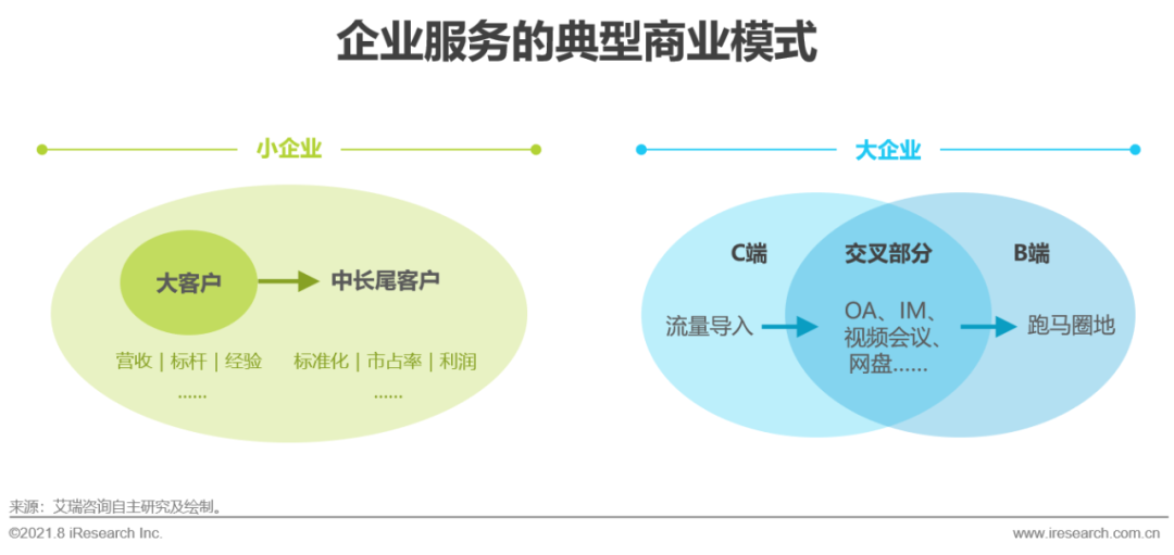 大型互联网企业除服务大型客户外,还有另一套打法:即从C端入手,不计成本地抢占高频、覆盖广的企业业务场景,OA、IM、视频会议等,成为必争之地。因这类B端产品均与自身的C端产品保持了一致的体验和账号体系,可以看作是以C端带B端。
