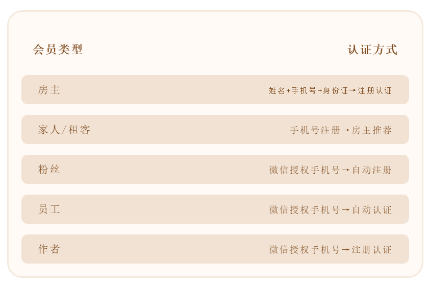 客户会根据不同的会员身份实行定制服务,会员总体分为“业主”与“非业主”两大类,无论房主、家人、租客都可注册成为业主会员。会员身份可以重叠,对于企业员工来说,还有专享的“员工”会员身份;对于《美好家》会刊的作者,还有专属的“作者”身份。