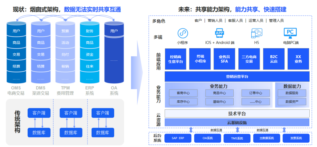 很多品牌企业都是以这种方式建立的信息化架构:面向品牌商和经销商建立经销商的订货门户、DMS系统,面向品牌商的营销费用管理,建立TPM费用管理系统,业务员对终端门店做访销、触达的时候,顺利获得SFA系统管理业务员的行为,后台也会有ERP、WMS、一物一码等系统。