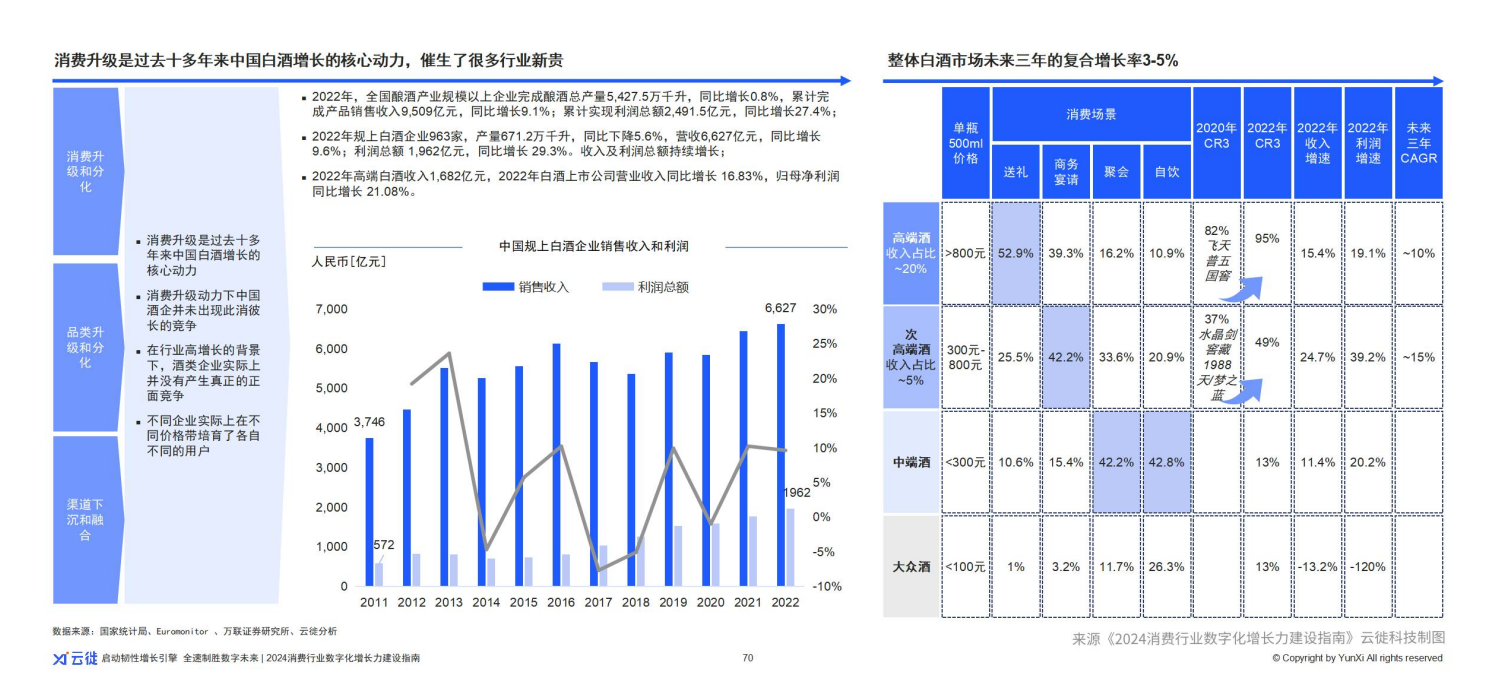 白酒作为中国传统的酿酒文化的代表,承载着千百年来的历史与传承。它不仅是一种饮品,更是一种文化的象征。白酒不仅口感醇厚,回味悠长,线下餐饮、聚会、宴请、送礼等社交场景都有白酒的身影。随着“少喝酒,喝好酒”健康意识提升,消费者酒类消费从价格敏感向价值敏感方向倾斜,更讲究独特的白酒文化属性和产区属性,高端/次高端白酒需求得以保持旺盛。因此,随着消费升级,白酒市场进入快速分化时代,部分白酒品牌出现价格倒挂现象,存量竞争加剧。这从正面要求酒企尽快进行企业转型升级,在供给端多端布局,多点驱动,用高端产品提高品牌影响力;同时拉开次高端和中低端市场空间,次中高端市场占领社交需求,而中低端市场占领大众化、日常化口粮需求。