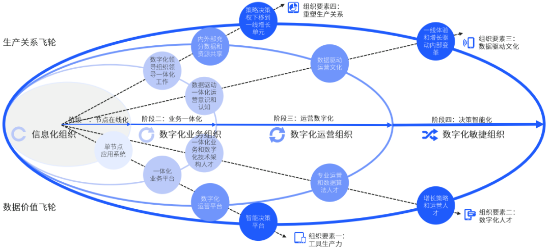 数字化技术驱使企业商业模式和运营方式发生变化,企业形态由封闭管控型,转向开放赋能型,最大化链接产业产品和服务资源为消费者给予最佳体验,从流程、数据和团队角度促进增长运营能力提升。第一时间是业务驱动力转型,一路向C,消费产业数字化变革序幕拉开,增长驱动力从制造端转向消费端:消费体验需求对整体产业链进行的逆向数字化改造已经开始,传统营销、渠道和供应链逻辑均要发生彻底革命,最核心是增长逻辑起点和驱动增长的资源运营逻辑起点发生改变。其次是运营模式转型,一路向D,满足部门职责、任务分工需求的僵化流程和孤立数据,全局非最优解,转变为满足增长和效率需求的策略迭代和流程优化,提高全局资源效率最大化。第三,从组织机制转型,一路向E,伴随数字化建设的不断推进,不断创新迭代的新组织形态,需打破原有科层制职能和组织边界,打通和聚合公司层面的各业务条线以及职能力量,形成面向消费者、渠道、产品和场景的一体化运营能力,支撑资源最有效的投向在各类增长源。